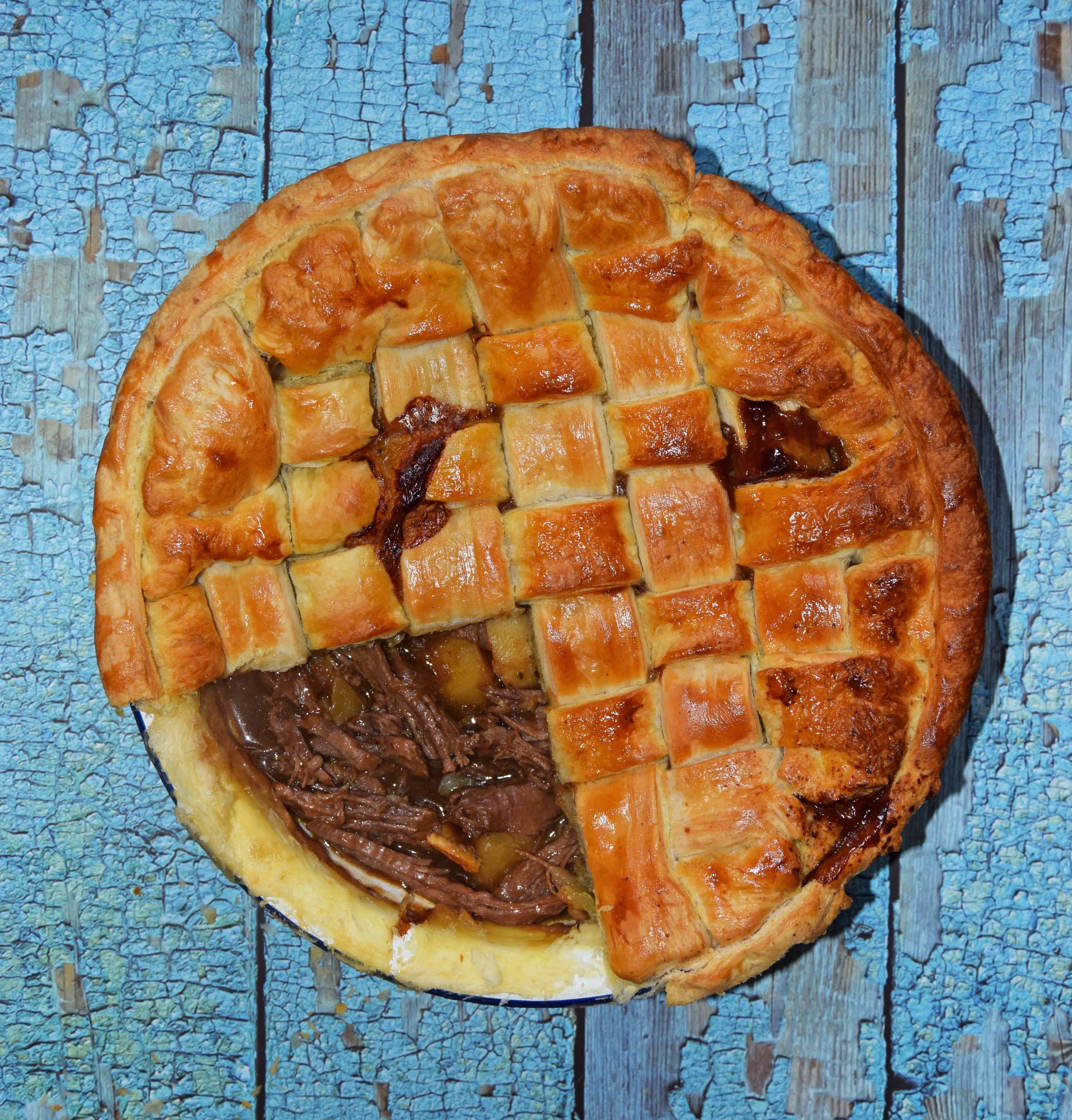 This is a rich and tasty pie using Guinness and marmite. The Beef is slow cooked and shredded and topped with delicious flakey pastry.