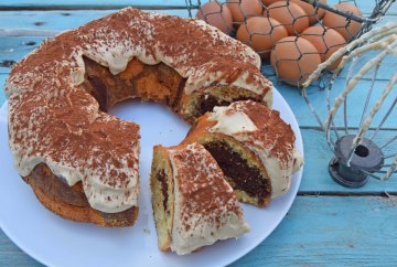 Layered sponge cake in the style of tiramisu with cappuccino frosting.
