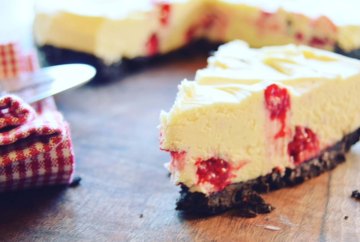 Non bake cheesecake with white chocolate, raspberry with a oreo crunchy base.