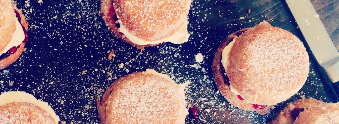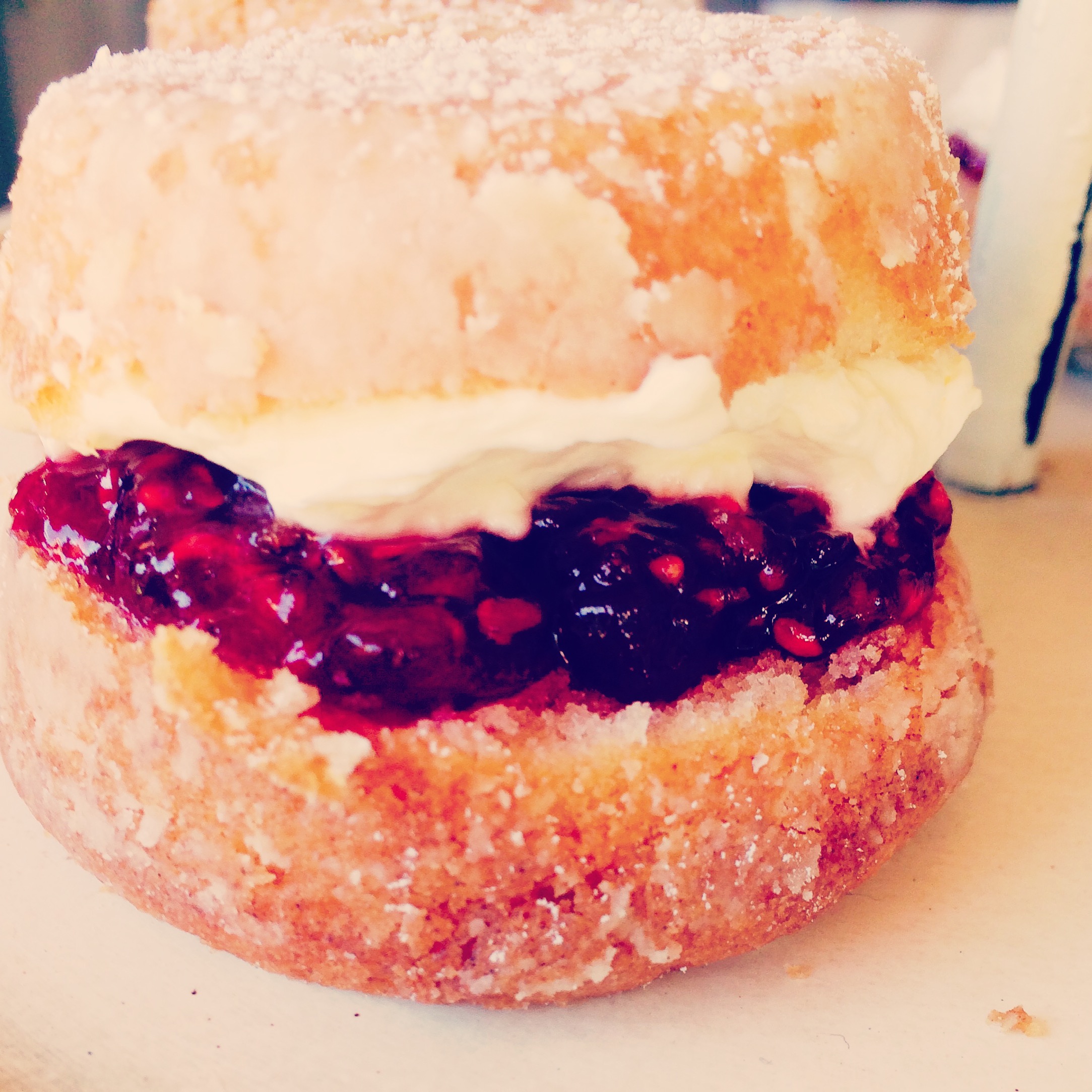 - Once cooled trim the top to be flat and turn upside down, carefully cut the cakes into half, fill with the jam and the cream then pop the top on and give it another sprinkle of icing sugar.