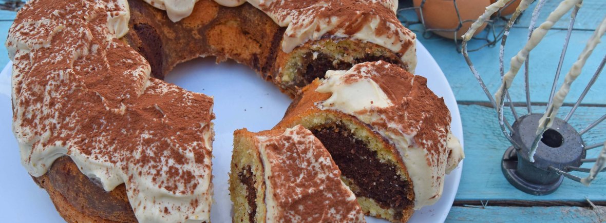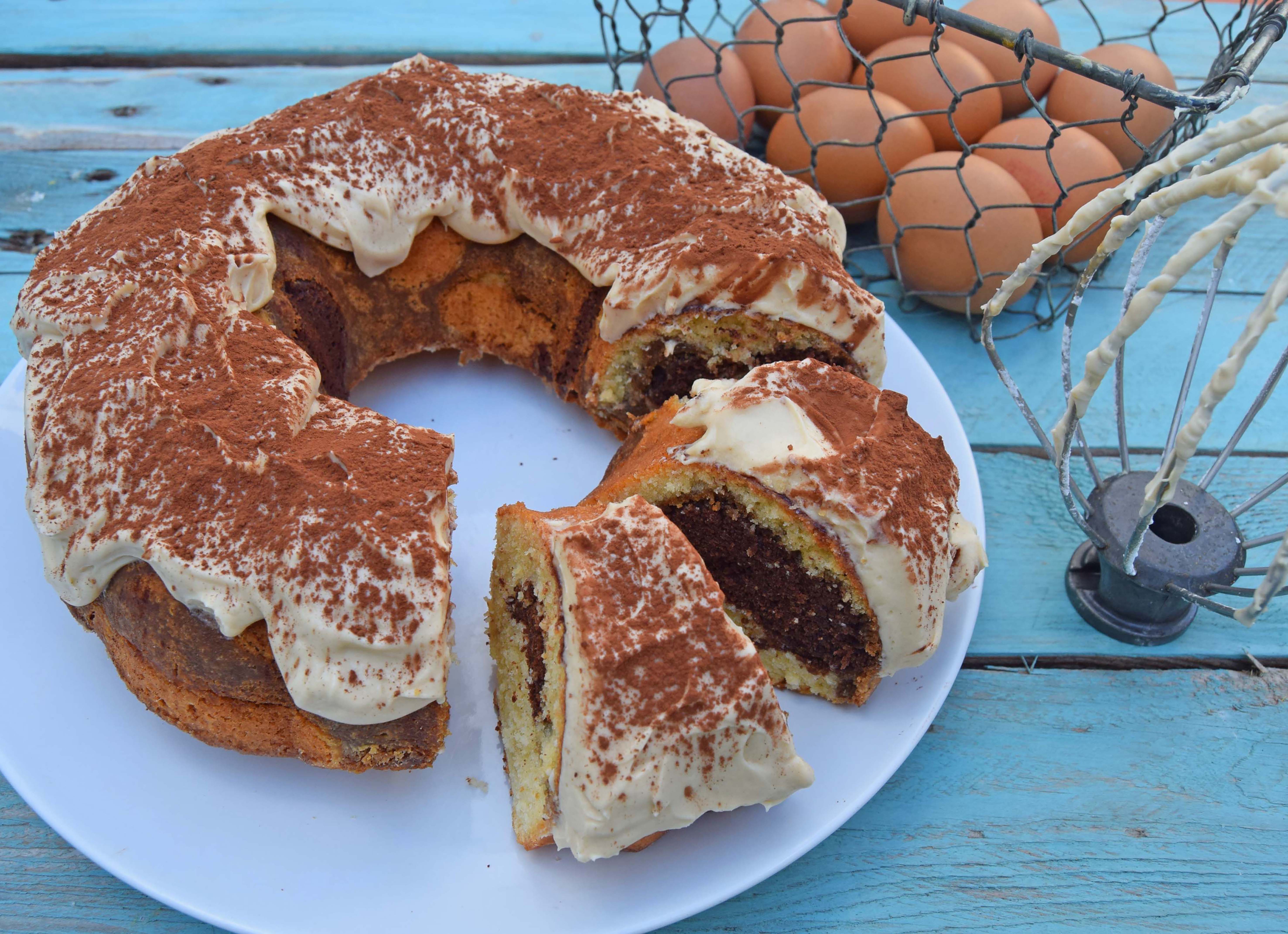 - For the frosting, whisk the mascarpone, espresso, and sugar together until thickened. Spread over the sponge and dust over the cocoa. Eat straight away!!