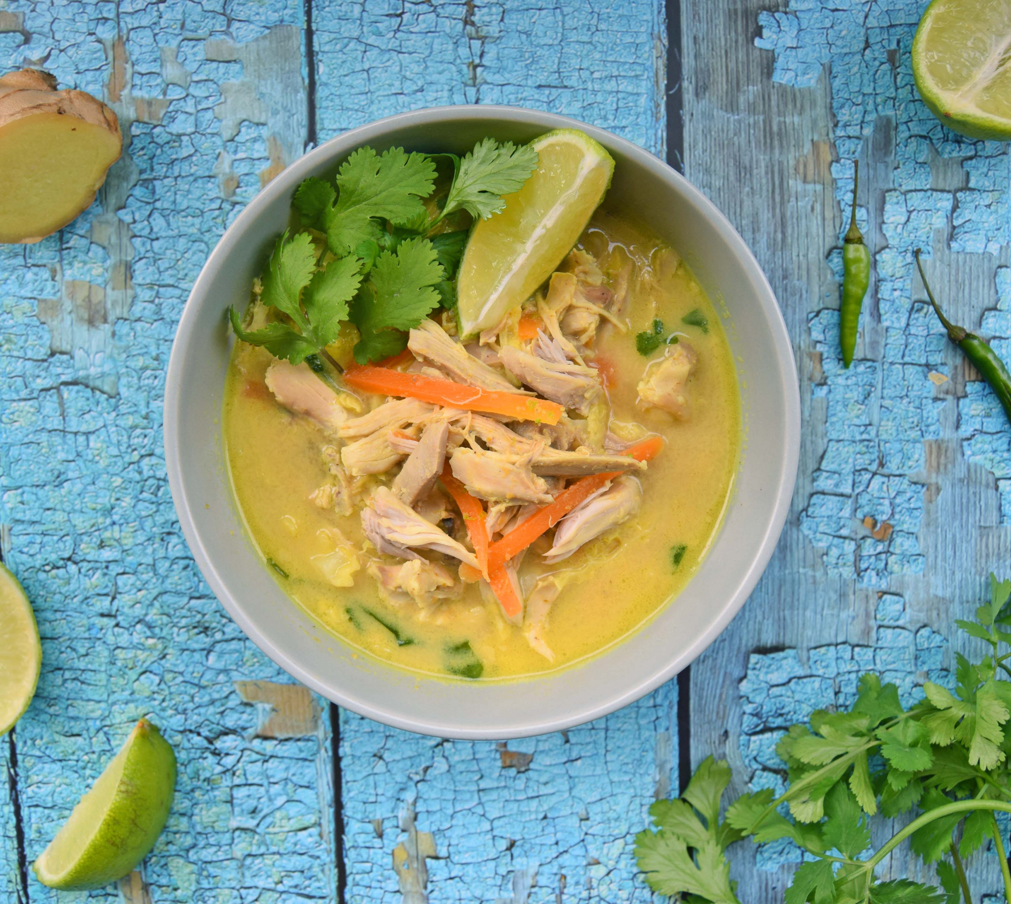 This soup is creamy and aromatic and very low fat. Inspired by my travels and my time at a cookery school in Thailand.