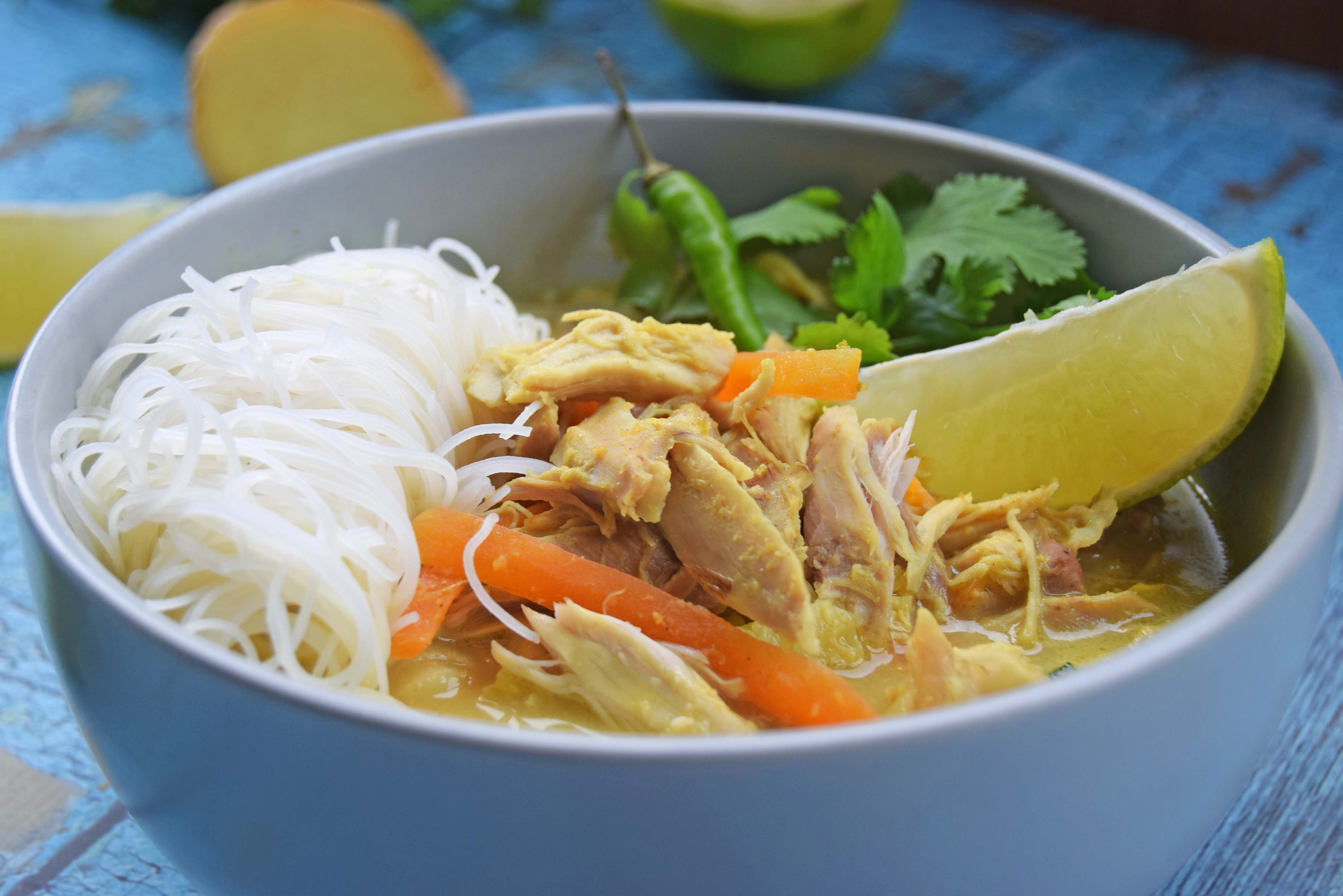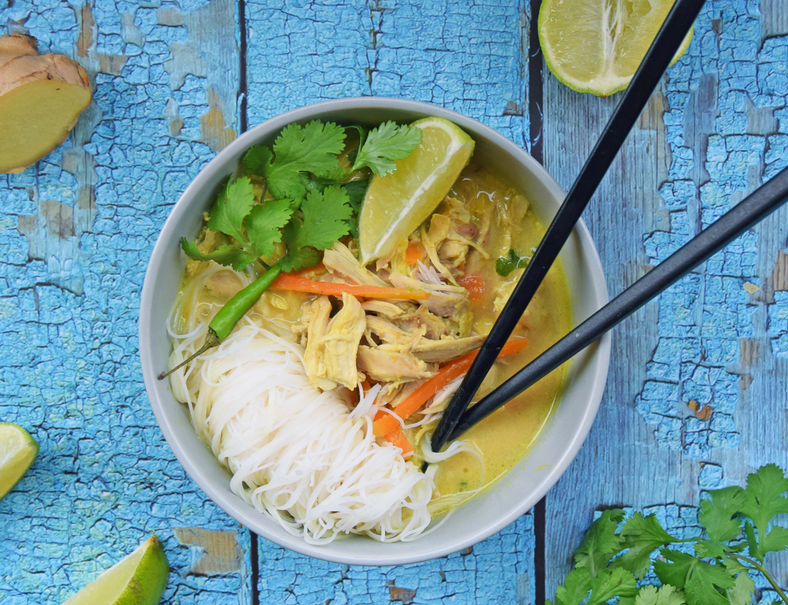 - Serve with rice noodles, fresh coriander leaves and lime wedges.