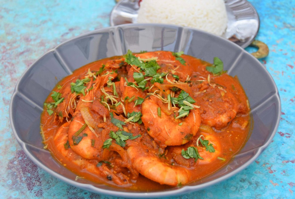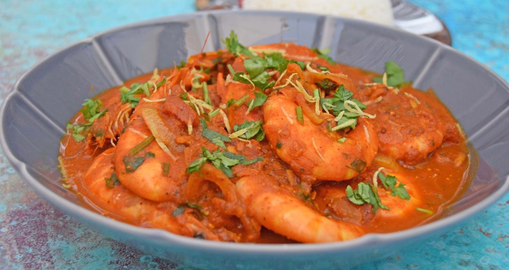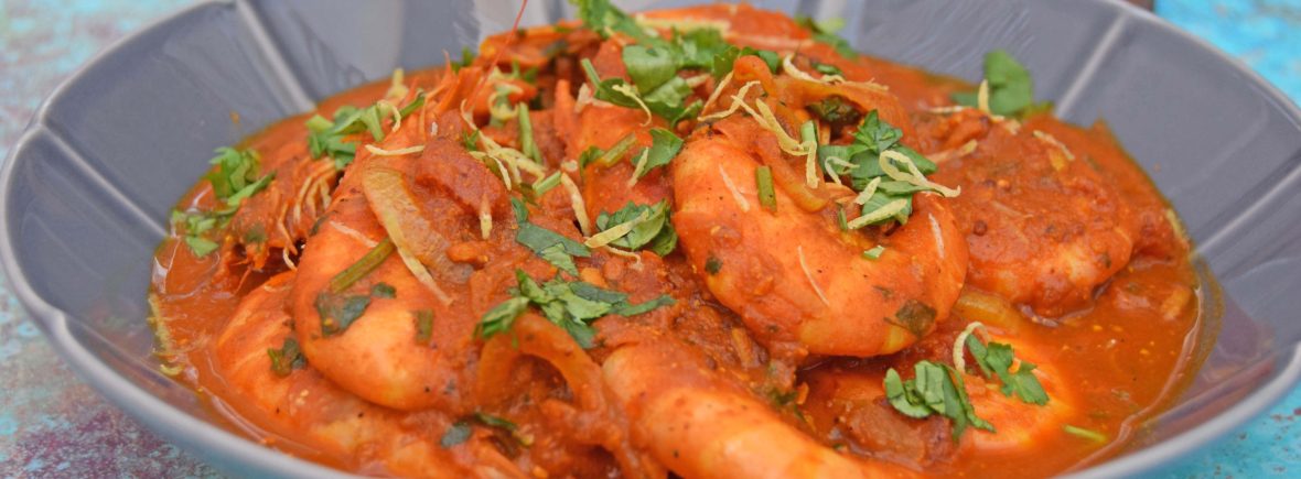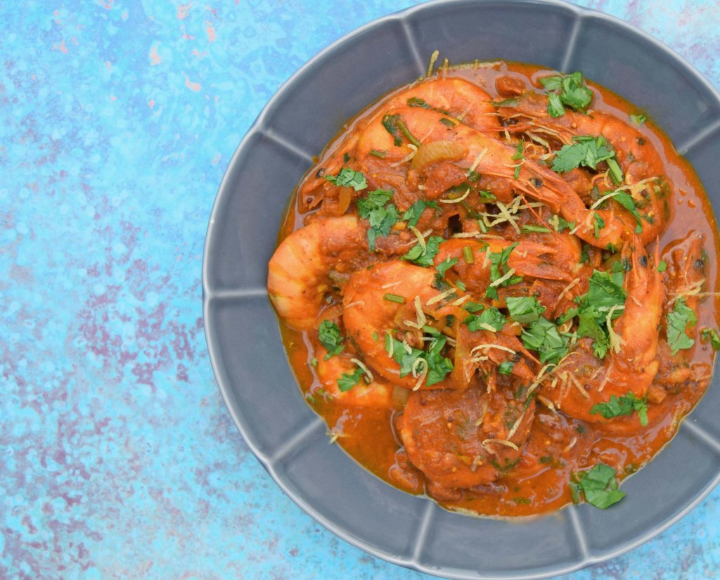 This is a basic recipe in the style of how my Mum used to cook curries. The heads and shells are left on, coming from an Indian background we always love to suck the prawn shells and juices before peeling and eating, we also like to eat with our hands even though it is really messy. It can also stop the prawns from shrinking, however if you prefer you can peel these before cooking.