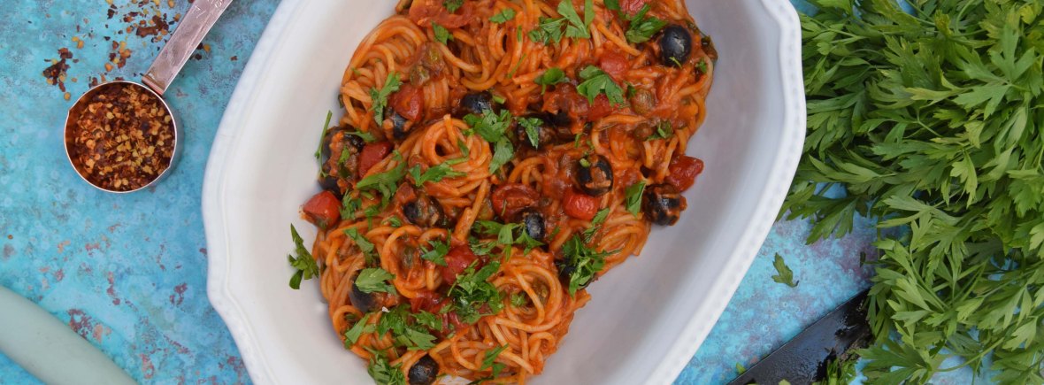 The flavours are tangy and unusual for pasta with anchovies seasoning the dish and capers which have the sourness, a little hint of chilli brings the whole dish together.