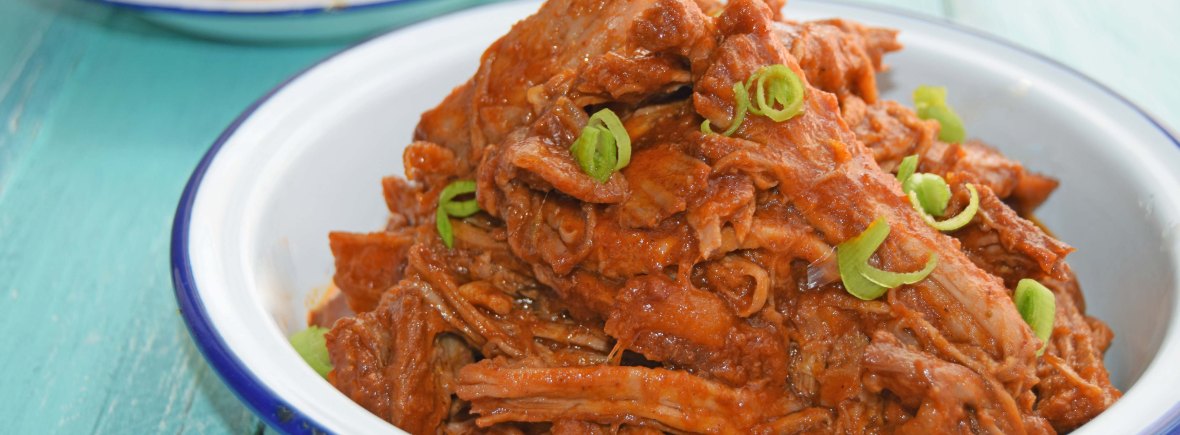 Slow cooked pork shoulder in a bbq marinade and shredded.