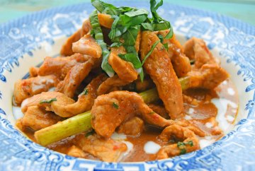 Pork cooked in a peanut curry broth and stir fry veggies with rice noodles.