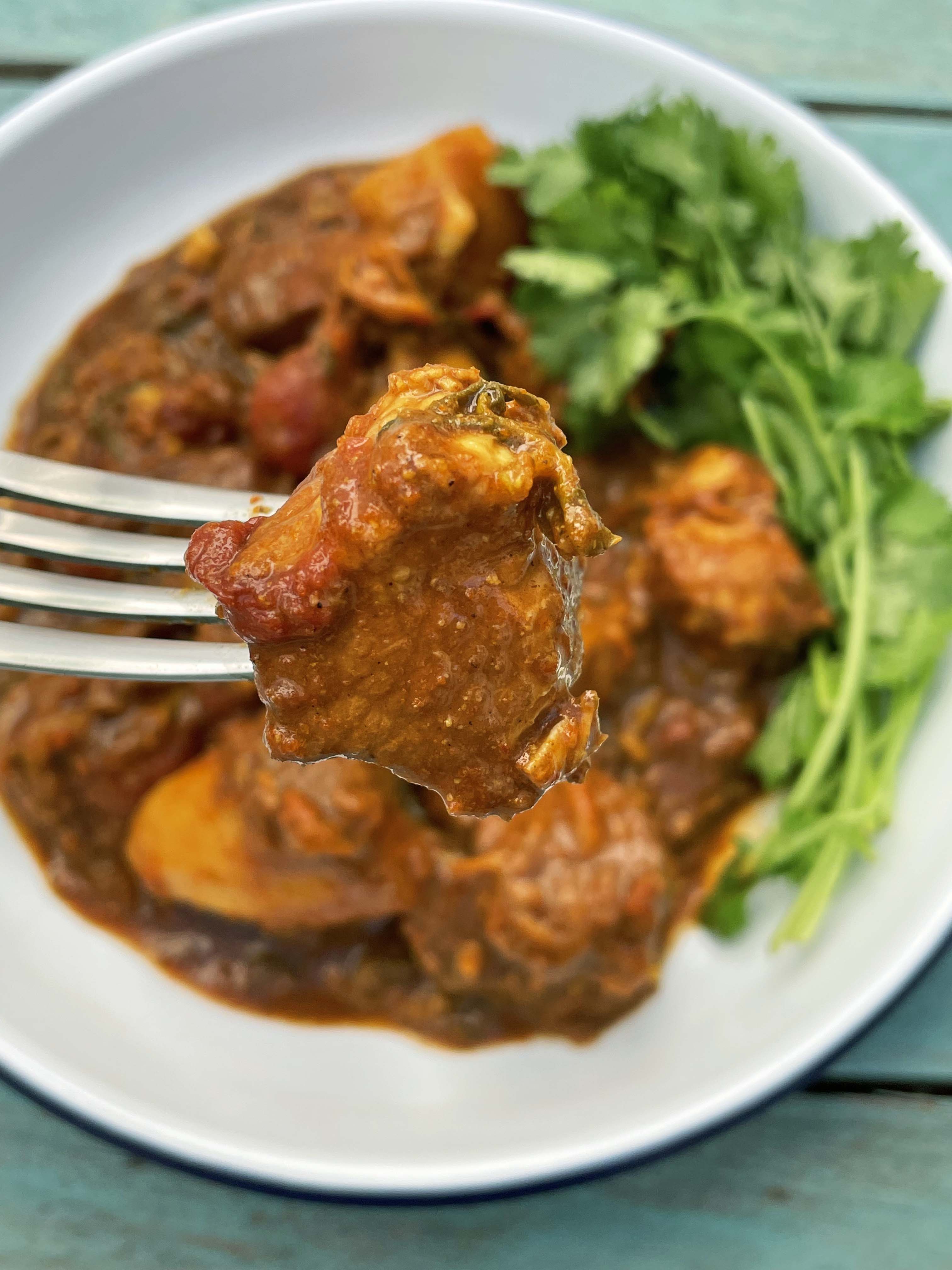 It isn’t like the British take away ‘Vindaloo’ this dish is a spicy and tangy curry and should be mopped up with breads.