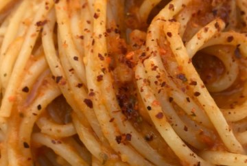 An Italian spicy sauce for pasta made from garlic, tomatoes, and chilli, cooked in olive oil. Vegan.